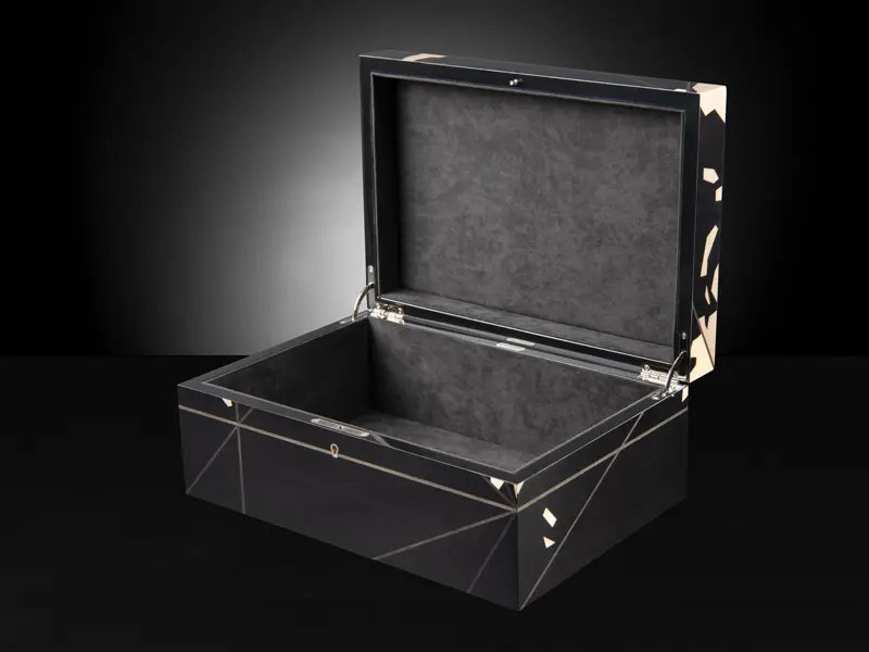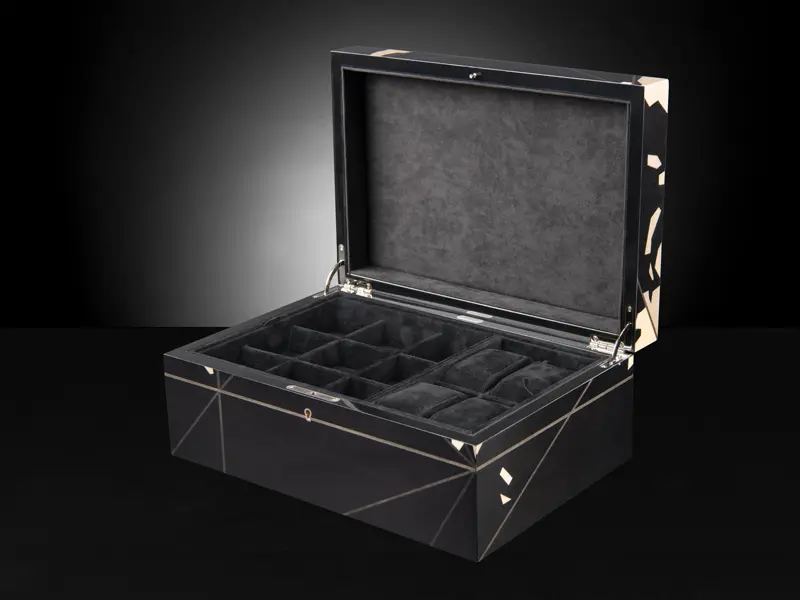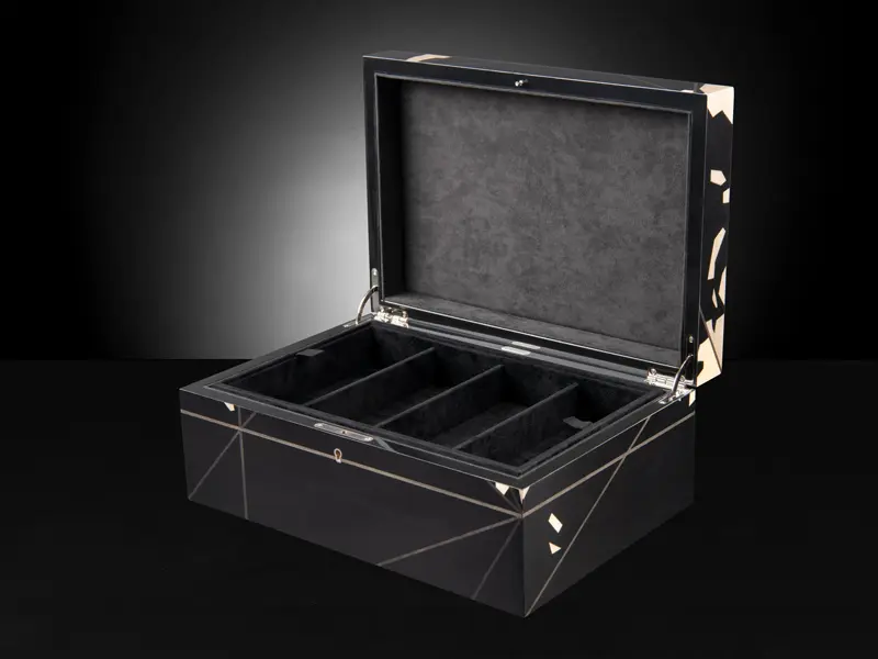 Il portagioie Columbus incanta con il globo in legno intarsiato sul coperchio e le cerniere cromate, che coniugano eleganza classica e moderna. L’interno in velluto nero offre un lussuoso rifugio per i gioielli. La targhetta personalizzata Ercolano ne attesta la qualità artigianale. Columbus è più di un semplice portagioie, è un compagno di viaggio nel mondo del lusso e della raffinatezza.