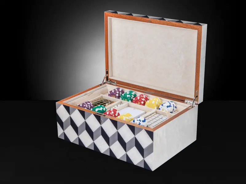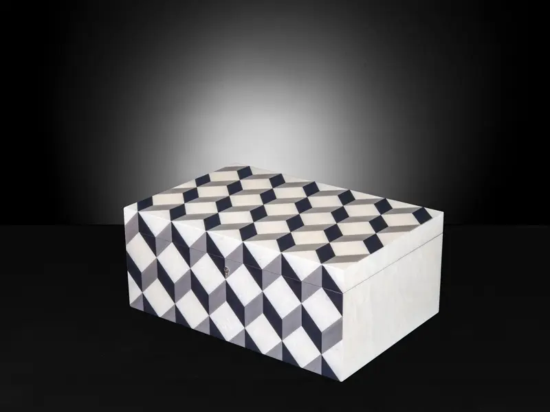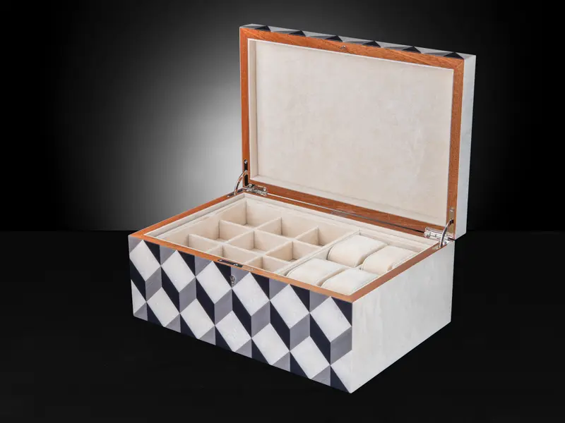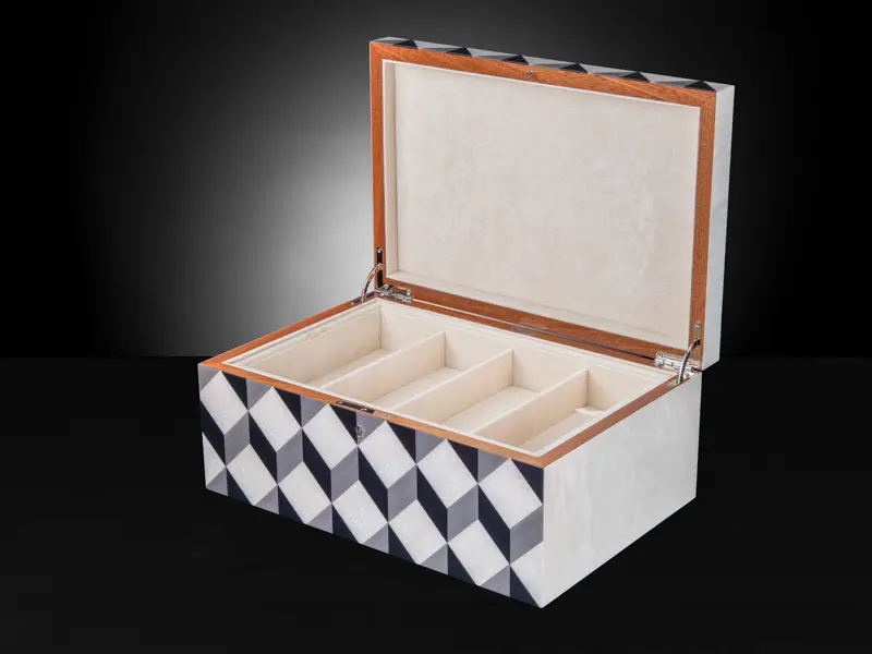 The Aurora Jewellery Box marries classic elegance with modern sophistication. With its captivating wooden aurora inlay and sleek chrome hinges, it offers a timeless blend of charm and contemporary style. Inside, luxuriate in the plush beige velvet interior, providing a haven for your cherished jewellery pieces. More than just a box, the Aurora Box is your ultimate companion in the world of luxury and refinement.