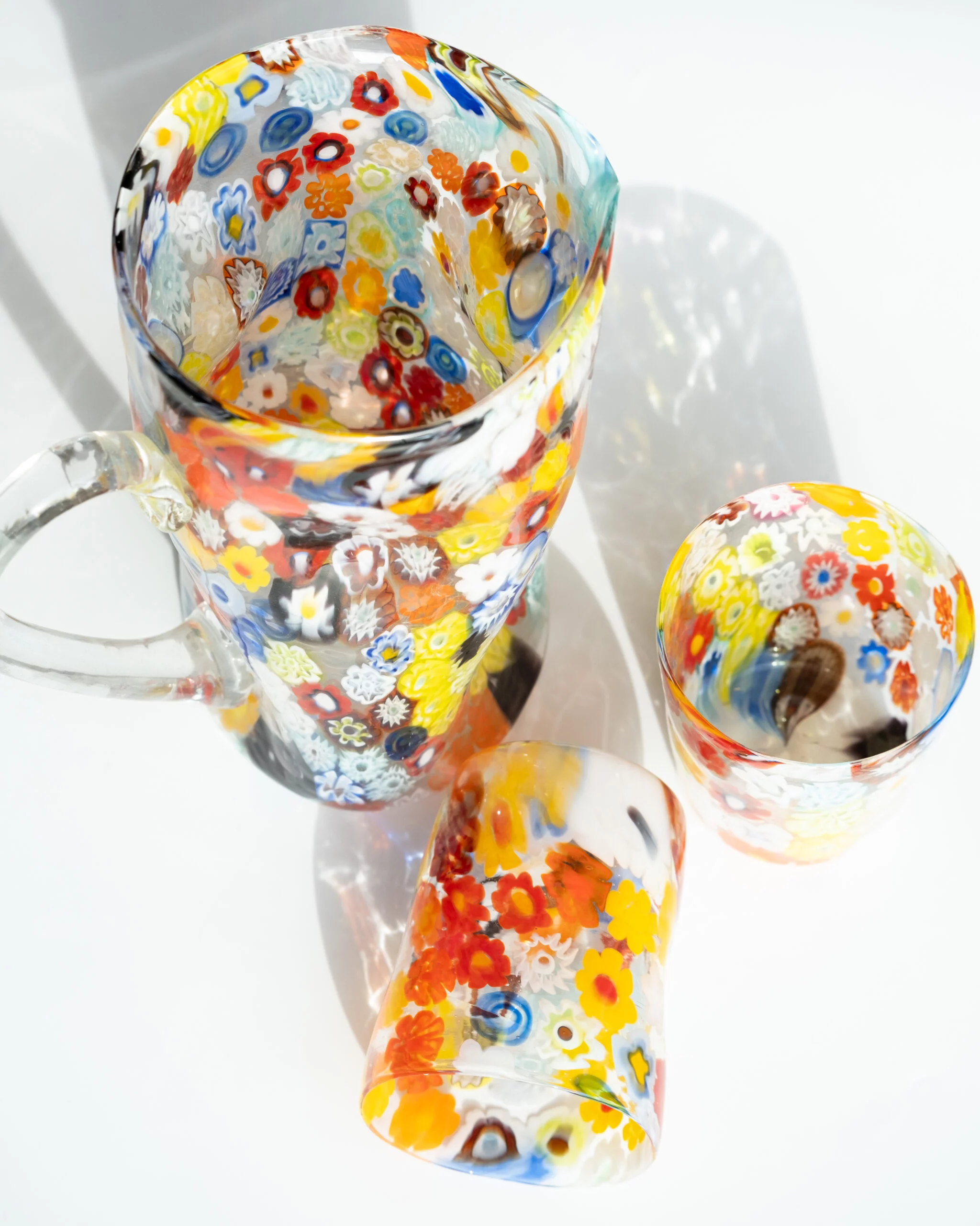 Handcrafted set in Murano glass with millefiori decoration.